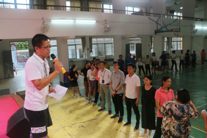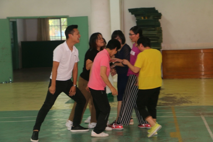 开学一个月,大家忙忙碌碌,每天在各自的岗位上努力奋斗,拼搏。活动的第三个环节让全体教职工能够放松心情,开心游戏。第一个游戏以年级组为单位玩“移形换位”的游戏,六个年级组同时进行,看那个年级组配合的最好。第二个游戏是“破冰游戏”,目的是让所有人都能放下顾虑,融合共处。大家玩游戏非常开心,放下工作,珍惜这美好的短暂的属于自己的时间。