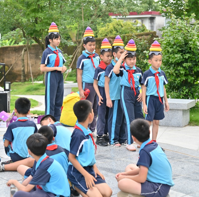 参观寮后村后,同学们在公园的空地上围成一圈,主动大方地介绍着自己的姓名、班级和爱好,气氛热烈。随后,心理老师带领着孩子们开展心理团建活动。第一项是投环活动,同学们井然有序地排着队,把手中的圈往特定的柱子抛去,他们脸上都洋溢着灿烂的笑容;第二项是彩虹塔帽,同学们小心翼翼地把塔帽戴在头上后,轻手轻脚地往前走着。第三项活动是袋鼠跳,一声哨响,同学们像袋鼠似的不停地往前跳,奋力地冲过终点。