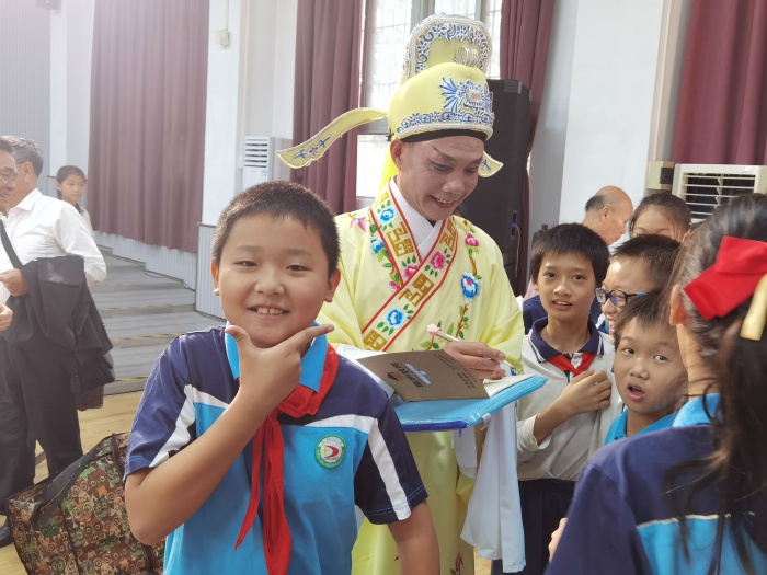 表演过程中,主持人向学生穿插介绍了粤剧唱法上的特点、粤剧特色及在音乐上的种类。普及知识的同时,主持人还邀请学生上台体验,学唱《今日大家开心笑》,欢乐的笑声溢满整个校园。台下的学生也忍不住手舞足蹈跟着吟唱。
