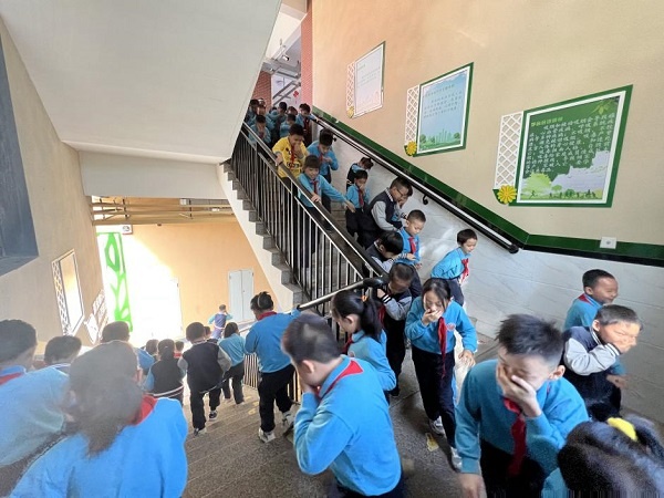 随着响亮的警报声响起,各班同学快速、有序地按照预定的疏散路线俯下身体,疏散到田径场的集合点。消防安全演练能有条不紊地进行,有赖于学校安全领导小组做足了充分准备。为了实施好这次演练活动,学校制定了详细的演练方案,对各班的逃生路线、正在课室上课的老师的职责,每层楼梯口负责疏导的老师的职责等都作了明确的规定。