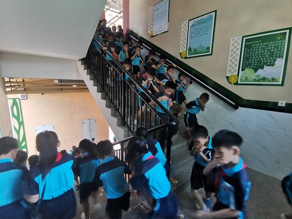 演练前,各班主任对学生进行了消防安全教育,提醒学生有秩序地从走廊、楼梯右侧低头、弯腰、捂口鼻地撤离教学楼,到操场汇合。