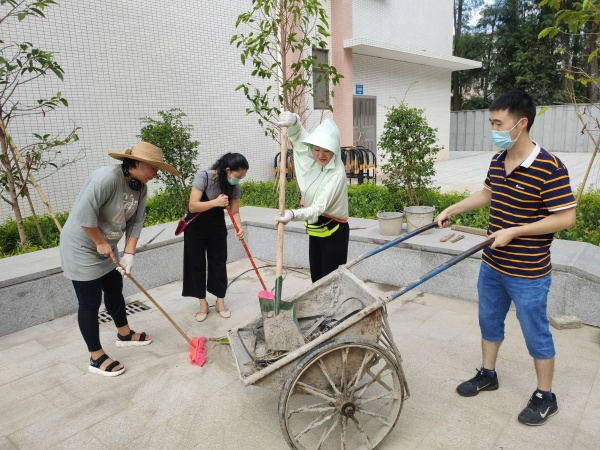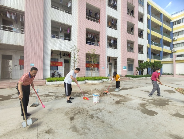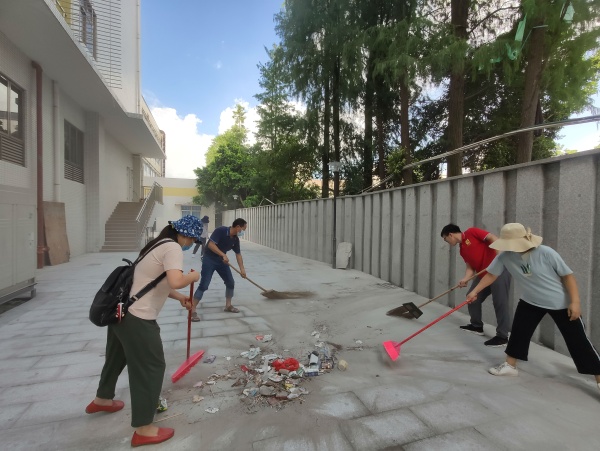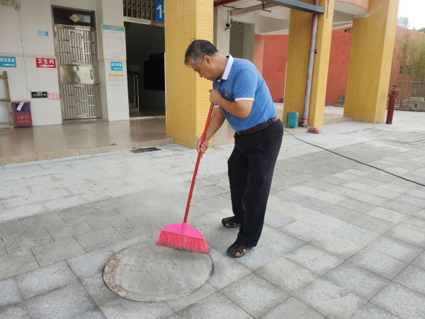 行动中,烈日当空,炙烤着大地,教师们面对校园景观改造工地地面尘土堆积,碎石随处可见,生活垃圾隐匿角落的景象没有就此退缩,反而热情高涨,手拿大扫帚,扛着大铁铲,推着斗车,兴致勃勃地投入到清洁行动中。为了把尘土堆积的地面进行彻底地清洁,有的教师拿着水管来冲刷,有的教师拿着拖把来清理;为了把隐匿在空调主机背后的生活垃圾,卢新泉校长用未戴手套的双手清理垃圾,在卢校长的率先垂范下,几位初一级老师纷纷用手把垃圾清理干净,充分发挥了不怕累、不怕脏的精神;他们如此认真地清洁,如此勤恳地付出,是因为把学校当做家呀!即便是挥汗如雨,依旧义无反顾,教师们的行动保证了校园各个角落干净整洁。