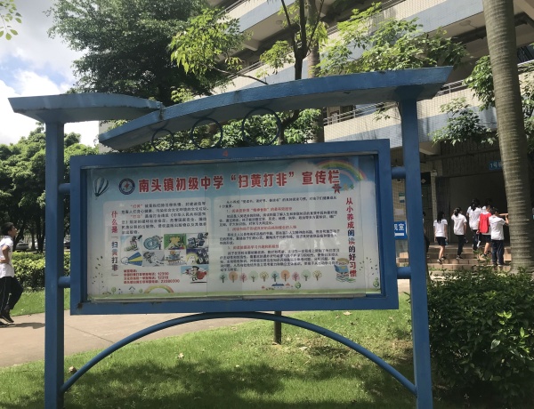 检查组成员率先巡视校园,察看校园宣传橱窗对“扫黄打非”的宣传工作是否到位。可见,南头镇初级中学积极落实“扫黄打非”进校园活动,在校道设置“扫黄打非”专栏橱窗进行知识普及;图书角张贴“护苗”专项行动海报,倡导绿色阅读,抵制有害出版物及信息;教学楼电子屏幕24小时滚动播放宣传标语,切实将“扫黄打非”宣传教育洒遍校园每个角落。