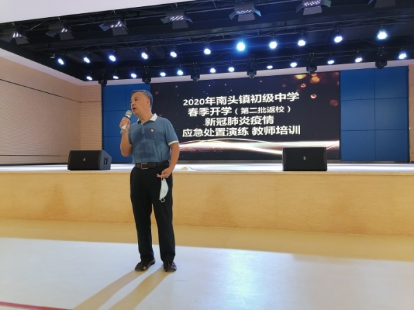 在第一批高三、初三学生顺利返校,以及第二批师生核酸检测完成的前提下,5月11日,中山市高一、高二,初一、初二学生返校,南头镇初级中学第二批教师于5月6日返校进行工作准备。2020年5月6日上午,南头镇初级中学开展第二批返校教师疫情防控培训,初一、初二级全体教师参加培训,培训由毛贤伟副校长主持。