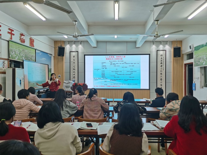 接着,梁青娇主任就“精准管理,促进学生良好习惯的形成”的主题,从贯彻“管理育人”、筑牢“活动育人”、营造“文化育人”三方面对班级管理工作进行了具体细致的指引,其中包括“班级公约”“班干部分工”“值日表”“班务细分表”“班级活动表”等。