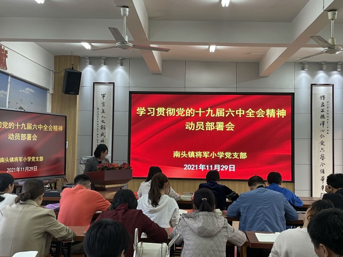 为认真学习贯彻党的十九届六中全会精神,把党史学习教育不断引向深入,11月29日下午,南头镇将军小学党支部召开学习贯彻党的十九届六中全会精神动员部署会。本次会议由学校党支部书记胡映芬校长主持,全体党员参与其中。