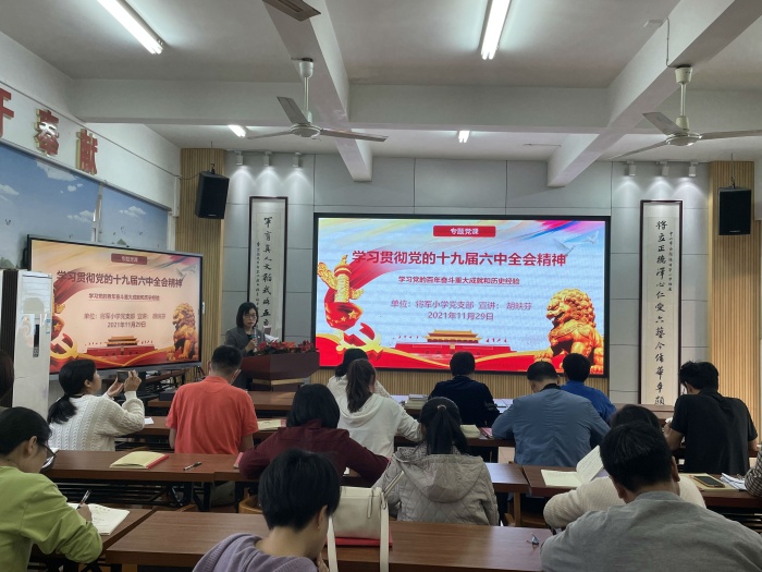 专题党课后,胡书记对第三阶段党史学习教育作了详细的部署安排。她希望将军小学党员教师带头认真学习贯彻党的十九届六中全会精神,增强学习贯彻的政治自觉性,切实用十九届六中全会精神武装头脑、指导实践、推动工作,把学习成果转化为实际行动,履职尽职、勇于担当,为学校的持续健康发展贡献自己最大的力量。
