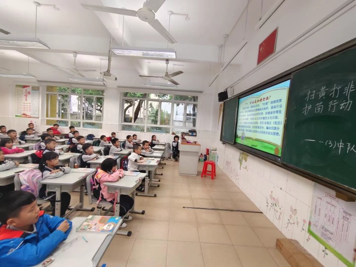 将军小学除了通过电子屏幕和宣传栏等大力宣传“扫黄打非”相关知识外,各班主任还利用班队活动课,通过精心制作的课件以及鲜明的案例、生动的宣传视频,运用巧妙的语言引导学生了解“黄”“非”的主要内容及其危害,要求孩子们自觉抵制“黄”与“非”,抵御有害思想、文化的侵蚀。各班主任还有针对性地引导和教育学生健康上网,不进游戏厅、网吧,不浏览涉黄的网站、网页,自觉构筑抵制黄色不健康内容的“防火墙”;引导学生了解盗版用书的基本特点,认识盗版的危害,鼓励学生自觉抵制购买非法出版物和盗版影像制品,以防上当受骗。课后,各班主任还布置学生利用课余时间创办手抄报,进一步使“扫黄打非”深入人心。