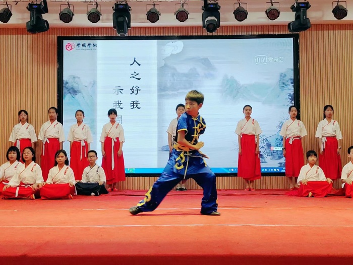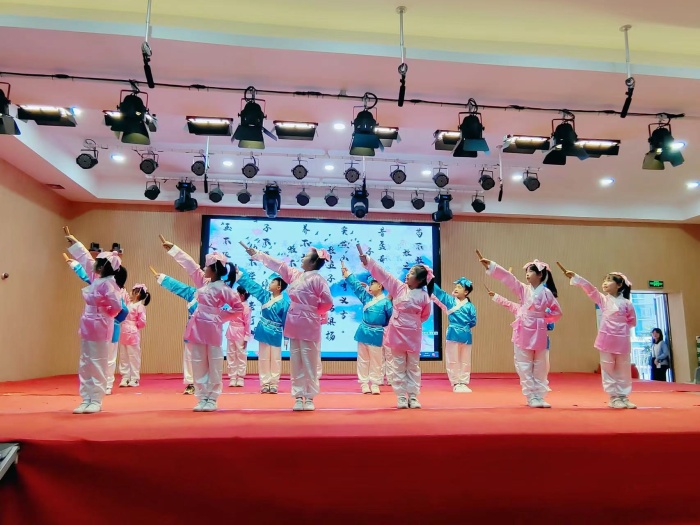 一年级的小朋友们带来的《百家姓》,二年级的同学们带来的《三字经》汇集了中国古代圣贤的智慧,是华夏大地经久不衰的文化瑰宝。流传千年的国学经典《千字文》由三年级的同学们诵读表演,富有感情的诵读配上悦耳动听的古典音乐,武术与舞蹈的相互演绎,让同学们在诵读中领悟了经典国学的魅力,体验了心灵深处的激荡。四年级同学的《声律启蒙》悦耳动听,余音袅袅。五年级的同学不仅将大家从“呦呦鹿鸣”的意境带进“鼓瑟吹笙”的音乐伴奏声中,更让人感受到了曹操求贤若渴的心情。六年级的同学们带来的是至圣先师孔子对学生的谆谆教诲——《论语》。