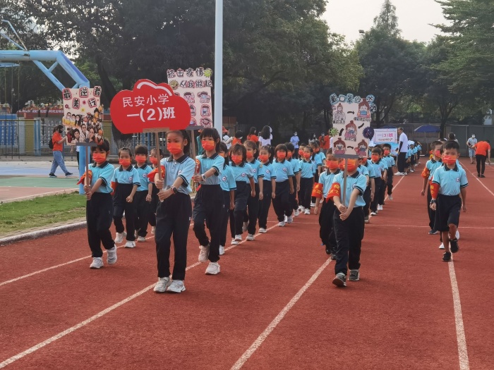 活动伊始,举行了本次体育节暨田径运动会的开幕式。南头镇教育和体育事务中心教研员黄再玲、郭淑娟、姚利芳,南头镇关工委副主任黄祺宗、委员梁细言,南头镇民安社区党委委员谷红霞到现场观看入场式。首先是进行入场仪式,随着运动员进行曲的响起,由各班运动员组成的方阵,一个接一个地在响亮、整齐的口号声中踏着整齐的步伐经过主席台,诚恳接受学校领导对他们的检阅。激昂的口号,铿锵有力的脚步声,全校三十个班级精神抖擞,神采飞扬,排着整齐的队伍依次入场,充分展现了民安小学师生的蓬勃朝气和青春活力。最后进场的是民安小学家长义工队方阵,他们为家校能够更好的合作付出了不懈的努力。接下来,是全校师生奏唱国歌。在庄严的升旗仪式结束后,民安小学严玲珍校长为运动会致开幕词,她希望运动员们能坚定理想信念,敢于拼搏、勇于进取、赛出风格、赛出水平,为班级增光添彩。在裁判员代表陈景隆老师宣誓以及运动员代表龚慧珊同学发言后,南头镇教育和体育事务中心教研员黄再玲老师宣布运动会正式开始。