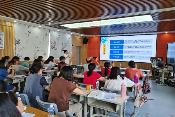梁柳珍老师围绕“基于‘双减’政策背景下,小学教研提质策略”进行了分享。首先从“双减”背景说起,解读了系列文件,重点说明了学校教育的职责变化,让与会者更加了解文件精神。随后,她从学校、教师、家长、学生等层面剖析了南头镇小学教研面临的困境,得到与会者的共鸣。如何破解困境,她提出了五点要求:一是教师要有党性,有与家长的共情能力,积极面对抓心态;二是学校要认真学习文件,落实好相关政策,循规蹈矩抓规范;三是继续把提升课堂教学质量作为重点来抓,优化课堂抓质量;四是把握核心抓根本,要落实好“立德树人”这一根本任务,要搭建学科素养培养和育人并举的桥梁;五是管好作业抓减负,突出作业的育人功能,鼓励内容分层、优化内容。梁老师围绕着“课堂教学改革提质工程”这一中心点,提出落实“三大行动”,夯实“四大支撑”这一实施途径,为“挤掉教学水分、提炼课改模式、开展智慧课堂试点行动”提出了具体的要求。