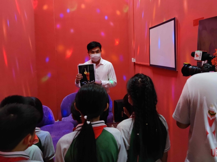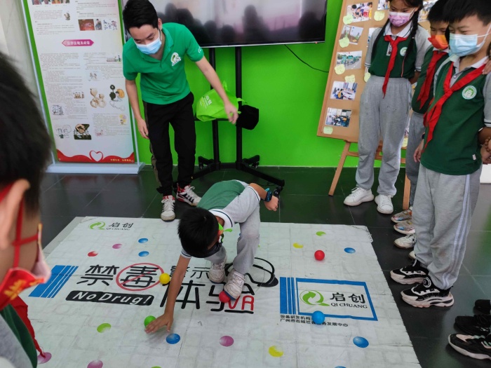 接着,学生们分成两组开展体验活动。禁毒基地设有多个体验区和展示区,包括模拟法庭区、模拟监狱区、模拟KTV区、禁毒迷宫区、禁毒设备区、毒品模型展示区。学生在社工的带领下逐一参观,通过观看宣传展板、毒品模型认识了毒品的特征和种类,引起了同学们的重视,提高其对毒品的警惕性,同时还了解了如何抵御毒品侵害的措施。同学们还纷纷参与了不同的禁毒游戏体验。其中最能吸引同学们的是吸毒致幻体验,这部分体验是先戴上特制眼镜,再抓小球,这时候是很难抓中,因为特制眼镜能让人产生炫目,从而达到类似吸毒致幻的感觉,所以需要抓两、三次才能抓中。同学们在游戏中体验吸毒后的不良感受,感受到了毒品的恐怖,直观认识到毒品的危害。以听、看、体验的模式寓教于乐,大大激发了学生学习禁毒知识的积极性和主动性,切实有效地增强学生识毒、防毒、拒毒意识和防范新型毒品的能力,营造了无毒校园的良好氛围。