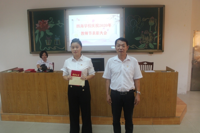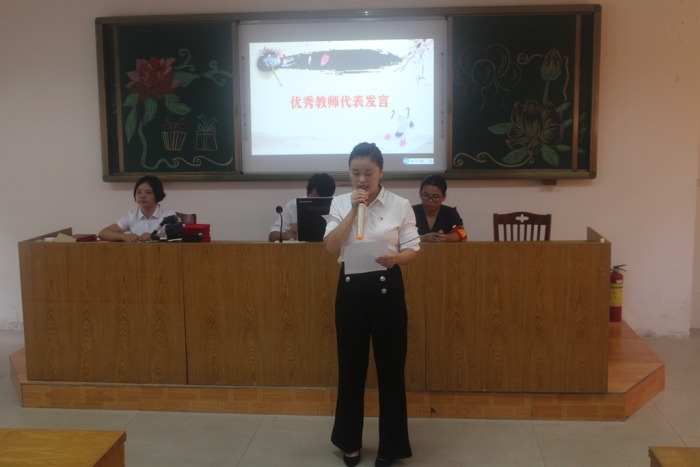 王校长在会上公布了学校获得市、镇、校三级优秀教师的名单,后校长为这些老师颁发了荣誉证书。孙主任作为优秀教师的代表发表演讲。她勉励大家用灵动的智慧引导学生,用高尚的人格感染学生,用文明的礼仪影响学生,用博大的胸怀爱护学生,争取多出成绩,出好成绩,谱写四海学校更加辉煌的明天!