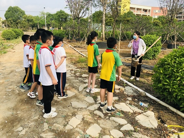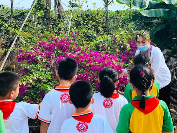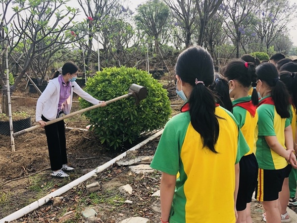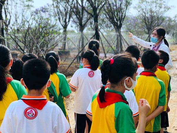 在老师的带领下,同学们来到花木场,满眼都是朗润的美景,各色各样的树木,花香在空气中飘荡。老师沿途简略介绍多种不同的植物的特点、习性,有镇花——三角梅、紫色的蓝花楹、变种鸡蛋花、香蕉树等,并现场展示传统的浇水技术,讲解现代快速浇水技术。同学们都展现出浓厚的兴趣,专心致志地聆听老师的讲解、兴致勃勃地观察了各种各样的植物。学生们的探究欲、想象力一下子都被调动起来。