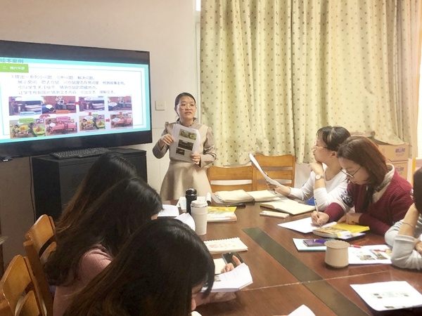 会议伊始,冯老师以王蔷老师的书《小学英语分级阅读教学:意义、内涵与途径》展开本校英语课题的解说。她指出,全体课题组成员要结合“双减”背景,探究“图片环游”如何切切实实落实到绘本教学、分级阅读教学、作业分层设计、家校合作中,从而让学生在英语阅读中培养思维品质。