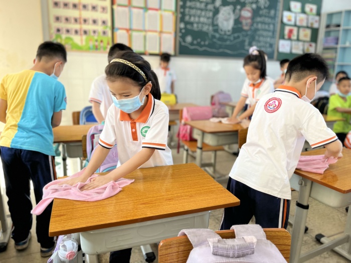 班会课后,全校利用大课间时间开展爱国卫生运动,对校园内以及校园周边各区域进行全面清洁消杀。同学们在老师的带领下分工合作、辛勤劳动,对教学楼、包干区、功能室以及校园周边进行全方位、地毯式的卫生大扫除,确保校园环境优美、干净整洁。同时,根据疫情防控工作要求,学校严格按照卫生消毒管理的标准,对各个角落进行全面而细致的清洁与消毒。