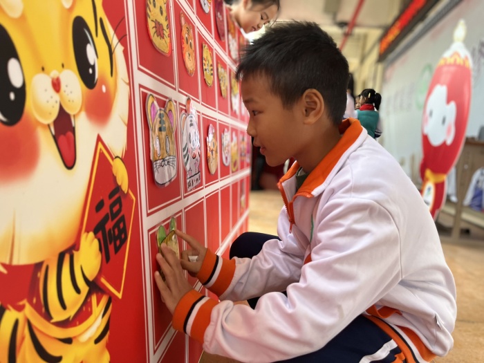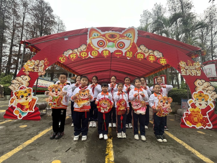 早上,光明小学校门口处处绽放着灿烂的笑脸,回荡着欢声笑语。孩子们被可爱的冬奥会吉祥物“冰墩墩”与“雪容融”吸引,纷纷上前对着镜头摆起造型来;“虎年画虎,以虎传福”,孩子们把自己画好的各种老虎形象,制作成虎虎生威的“百虎图”。在热闹的氛围中,孩子们开开心心地迎来开学日。
