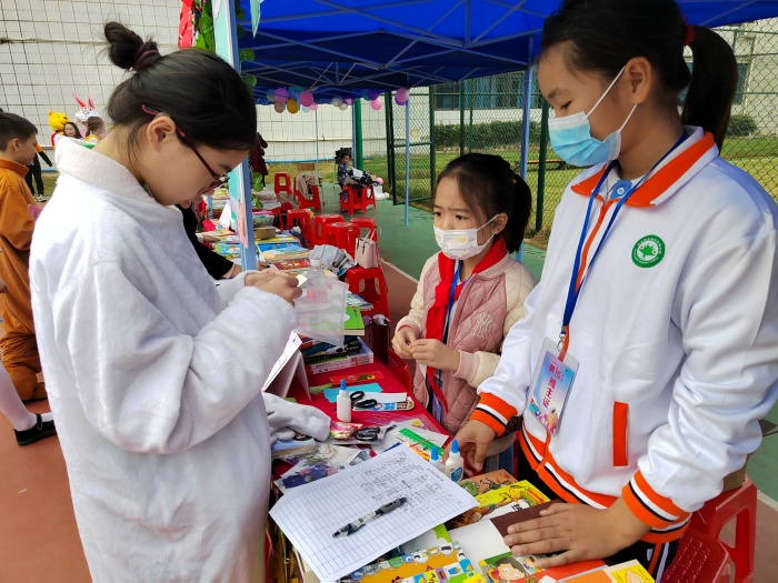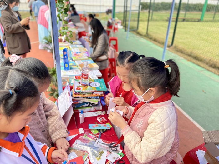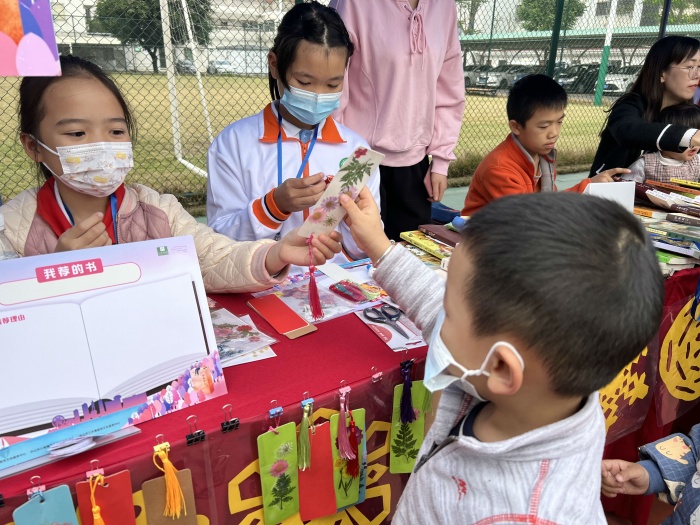 晒书会上,老师、家长和同学们有的在学校的摊位上热情地推荐好书;有的拿着自己的书去其他摊位交换自己喜欢的书籍,互相交流读书心得。