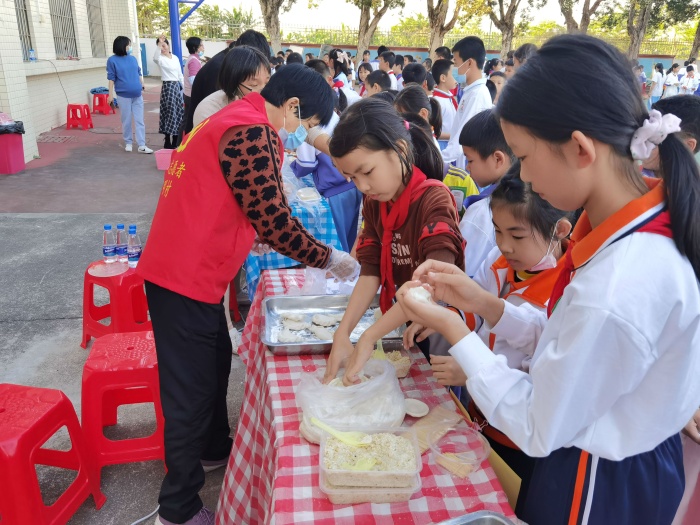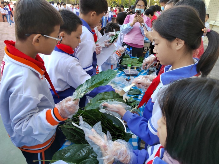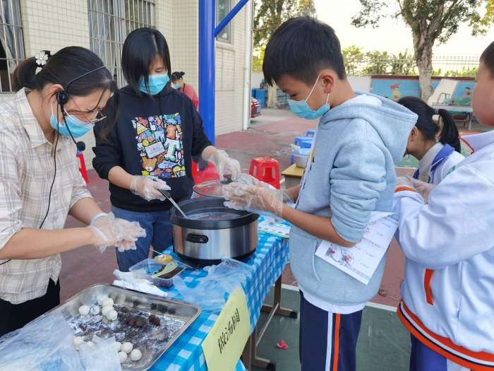 在传统美食摊位,在老师们的带领下,同学们将日常劳动的收获成果转变成全校的传统美食共享大会。瞧,同学们大展身手,化身“小厨神”,制作出了一道道色香味俱全的传统美食,饺子、香汤圆、茶果、冰糖葫芦、油角、艾饼、还有三角特色美食水煮生鱼等等,可谓应有尽有,令人三尺。