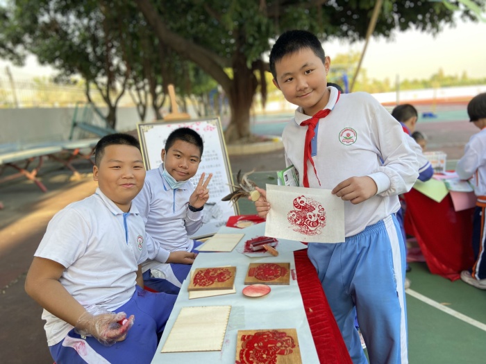 在传统工艺摊位上,同学们围坐一起,积极参与了陶艺、茶艺、剪纸、板画、布染、再造纸、风筝制作、毽子制作等传统工艺制作,场面温馨。