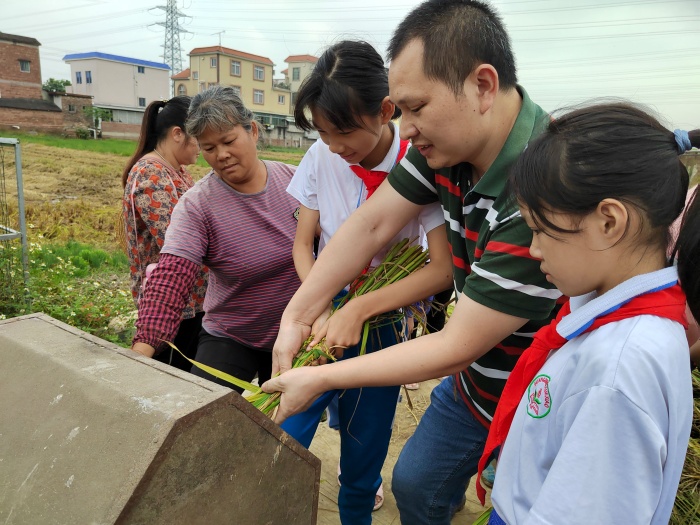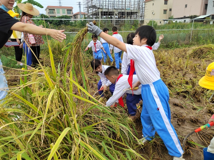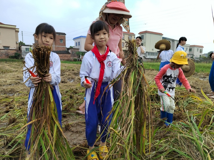 三角镇光明村的稻田里稻穗低垂,谷粒饱满,呈现出一派丰收的景象。11月7日下午,三角镇光明小学组织了25个家庭开展水稻收割亲子劳动教育活动。