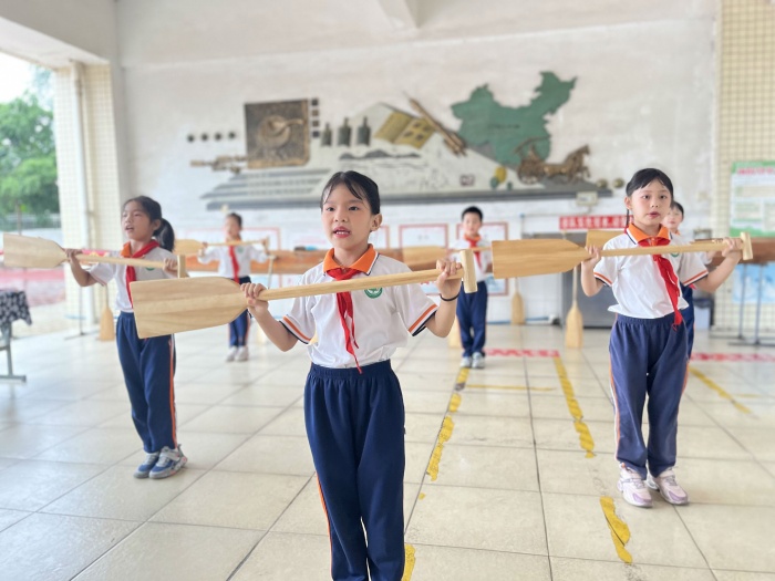 接着,非遗小小宣讲员李乐帆和钟芷晗带领老师们参观了学校的非遗传承基地,他们用生动的语言向大家展示了三人根艇赛的独特魅力。老师们还在非遗传承人李健球、教练陈见明的指导下“沉浸式”体验三人根艇运动,挥动着手中的船桨,体会三人根艇带来的激情与力量。
