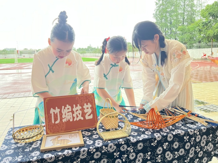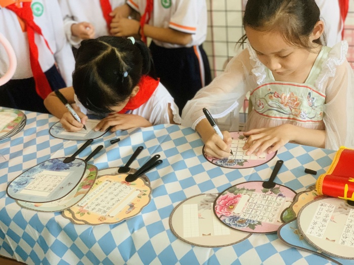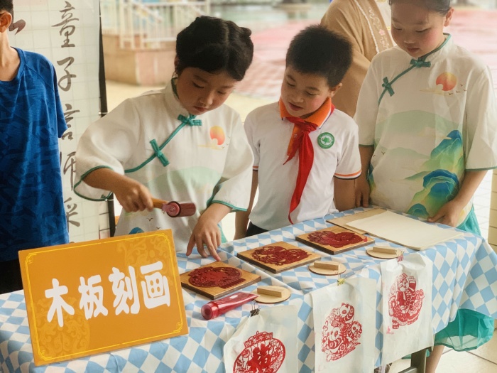 二年级6位孩子首先带来根艇操表演。学校把经典诵读《弟子规》与“三人根艇”文化相融合,创作了根艇操,孩子们手拿船桨,齐诵《弟子规》,展现了同心协力、力争上游的“根艇精神”。四(1)班22名孩子带来古诗《小池》表演,诗歌与音乐相结合,唱出了对初夏荷花的热切期待。学校一直以来注重学生传统文化项目的渗透与学习,通过扎染、造纸、剪纸、编织等传统文化项目摊位展示,向在场的老师展示了近年来学生的学习成果。现场还有体验环节,参观的老师在学生的示范下动手体验,领略传统文化的魅力。