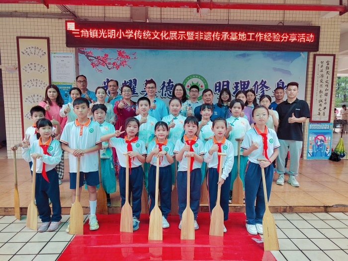 一个闪电,白亮亮的雨点紧跟着落来,砸在操场上,嘀嘀哒哒地响;砸在河涌里,唤起一串串的水泡。雨下得够大,却浇不灭光明小学孩子们的热情,4月24日下午,学校开展传统文化展示暨非遗传承基地工作经验分享活动,镇内各中小学教师代表、光明小学全体班主任和学生们共50多人参加了活动。