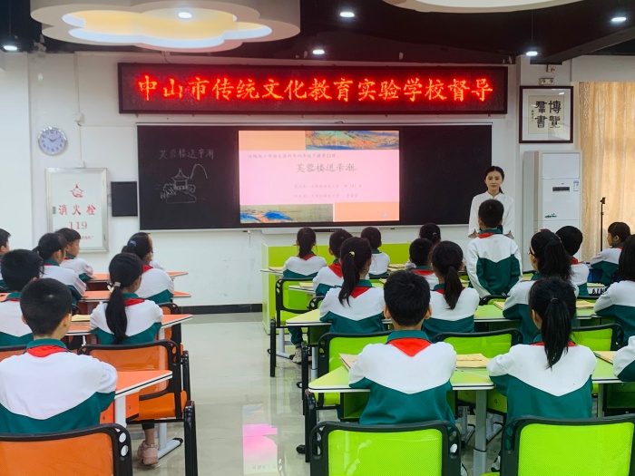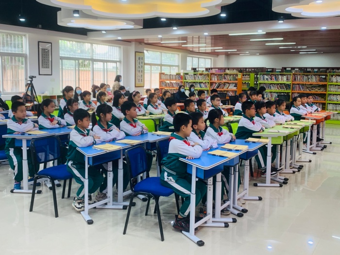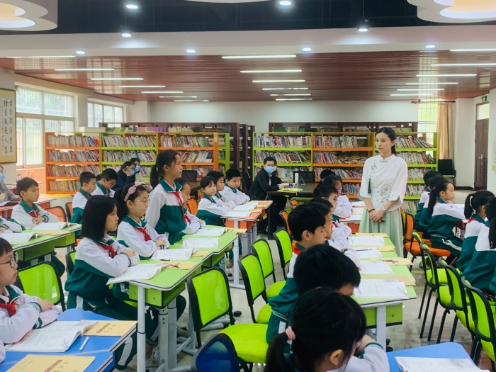 活动第一项,吟诵课题组成员李莹莹老师在学校图书室为大家带来传统文化展示课——《芙蓉楼送辛渐》,全体行政、骨干教师代表陪同专家老师们集体听课。