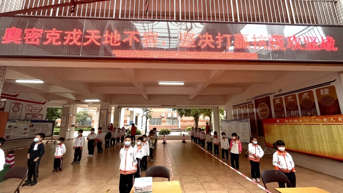 当天一早,蟠龙小学黄文景校长带领行政人员和教师志愿者提前来到检测点位,做最后的准备工作。学生按预设的时间和班级顺序到达检测点位,所有学生服从班主任安排,听从现场工作人员的指挥,严格按照要求佩戴口罩、间隔一米,做到安静有序、文明有礼。