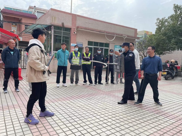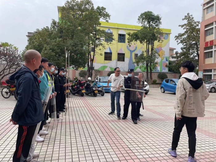 2月12日下午,三角镇三角小学邀请沙栏派出所梁警官为学校“最小应急单元”小组的成员开展培训及演练。梁警官首先了解了三角小学“最小应急单元”小组的组成,并对小组成员的配对提出了宝贵的意见。随后,梁警官为学校教职工介绍了长叉、盾牌、丁字棍的使用方法,并详细示范。梁警官还向参加本次培训的教职工进行了反恐防暴知识的专业培训,从砍杀等常见暴恐事件的类型、特点、处理方式及歹徒心理入手,结合具体案例对反恐防暴的理论知识和要点进行了讲解,并与同行的警察同志一起现场展示。