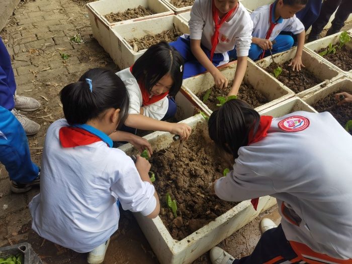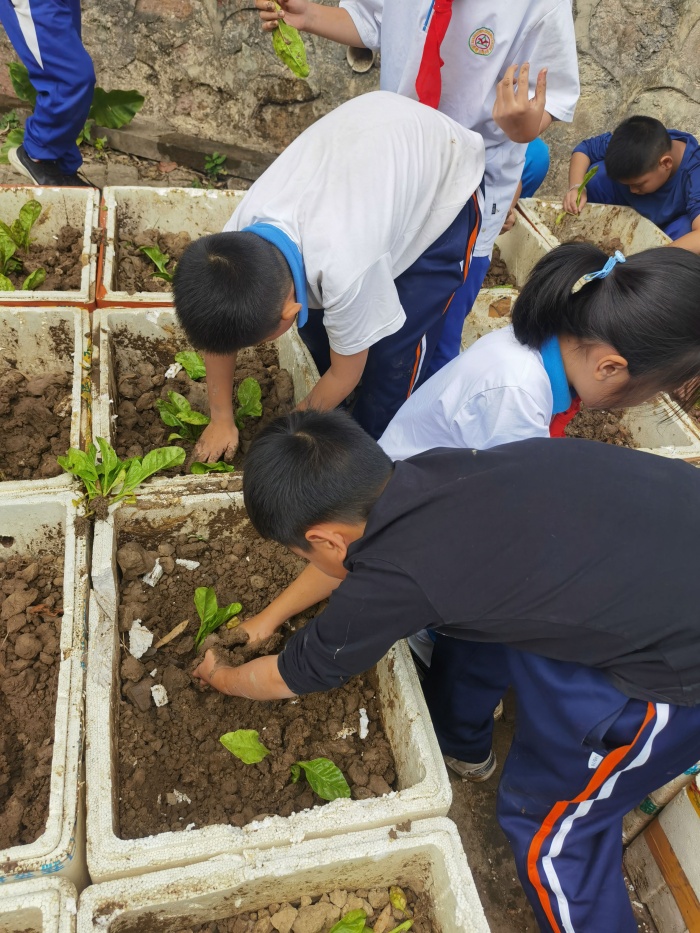 随后,同学们在听取了吴主任和现场老师的讲解后分成不同的劳动小组。负责松土的同学熟练地拿起土锹、铲子撸起袖子加油干;负责栽培的同学小心翼翼地将青菜幼苗种植到土里;最后负责浇淋的同学悉心地给每一株青菜浇上水。在劳动实践基地内,同学们亲手松土,栽培下了不少的青菜幼苗,他们通过培土,浇水等进一步感受到了劳动实践的乐趣,增强了动手能力。