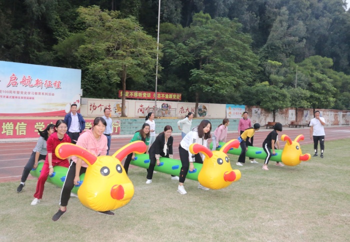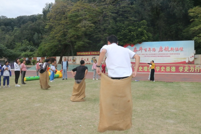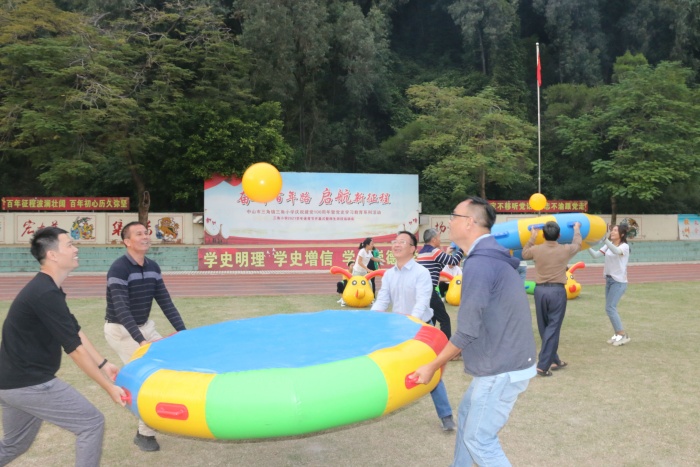运动会除了展现学生们的风采,老师们也同样在运动会中展现自我,突破自我。在教师趣味运动会环节,老师们配合默契,展现出三角小学教师坚持不懈,勇往直前的精神!