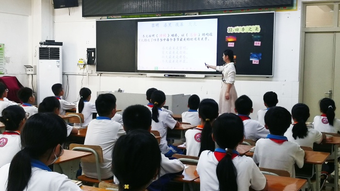 本次新教师汇报课,李老师呈现的是五年级的阅读教学课例:《四季之美》。在课堂中,李老师抓住了“美”这一条主线,让学生在充分朗读感悟后,体会作者笔下的语言文字美、韵味美、选材美。接着引导学生通过观察图片、感情朗读、延伸联想等策略展开丰富的想象,体会作者所要表达的四季之美。