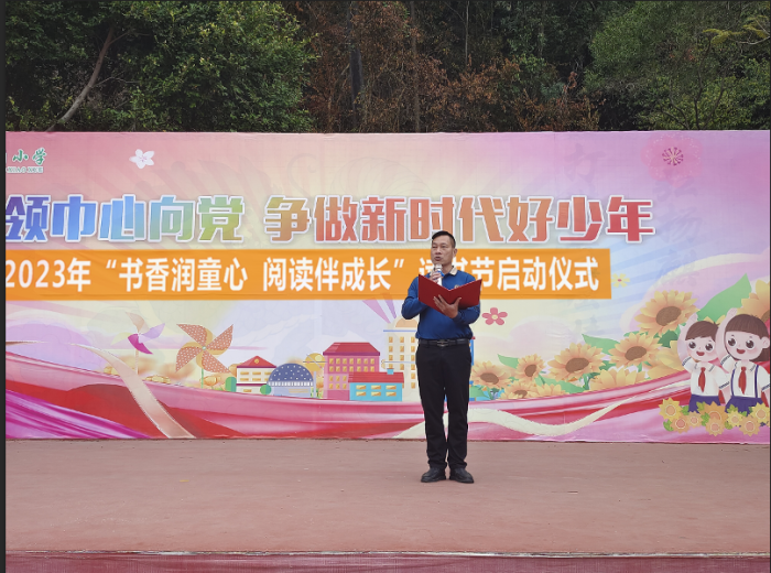 启动仪式第二项,由三角小学副校长黄丽娟宣读《三角镇三角小学2023年“书香润童心,阅读伴成长”读书节活动方案》。黄副校长向全体同学发出倡议,号召同学们积极参加读书节的各项活动,将知识运用到学习及生活当中,努力做到知行合一。