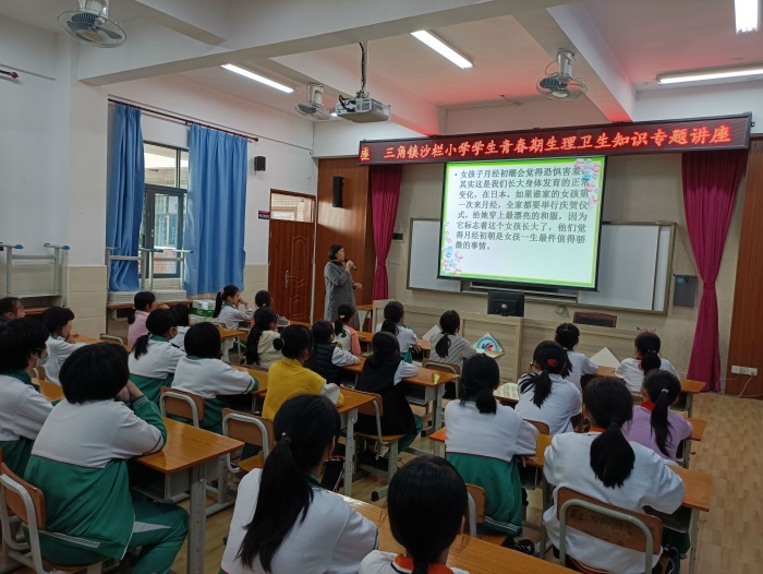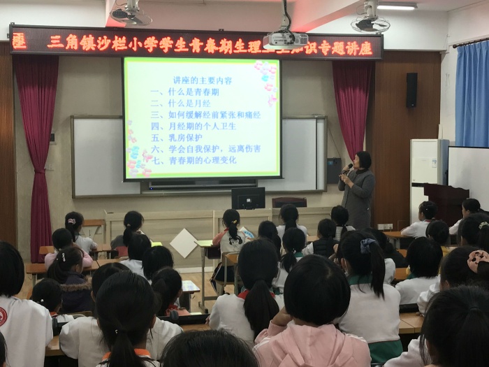 讲座由沙栏小学杜雪梅副主任主讲。首先,杜老师娓娓述说,用幽默生动的语言,深入浅出地告诉同学们什么是青春期,指出青春期女生生理的变化和自我保护措施。接着,杜老师列举了利用在“学习强国”平台上收集的很多同学们平时最关心、也是比较敏感的实例,引导她们学会如何保护自己,爱惜自己。最后,杜老师引导同学们要树立正确的价值观、价值观、世界观,努力学习,做一个阳光快乐的女生,拥有一个美好的人生。