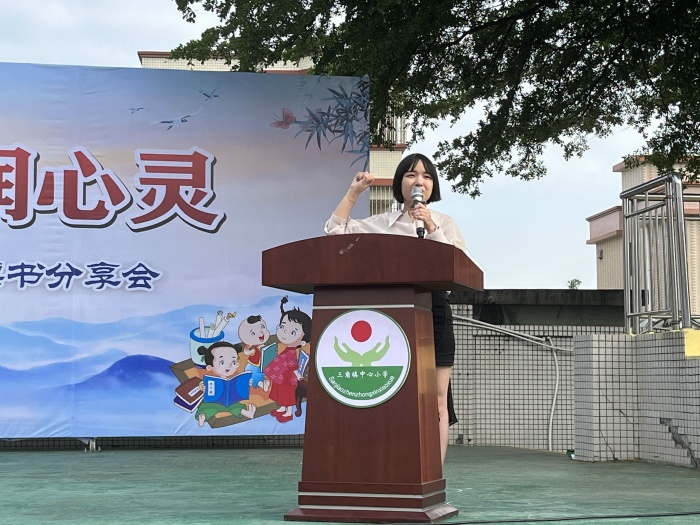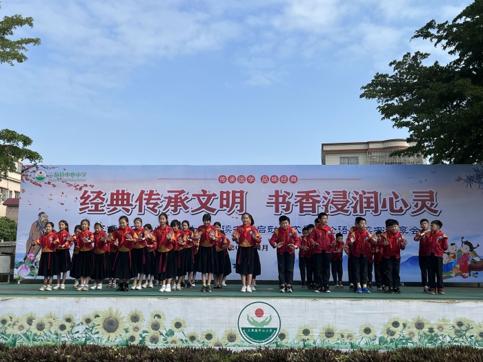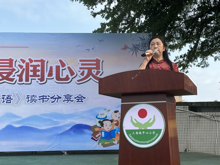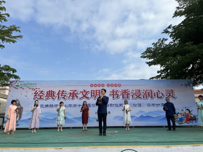 主持人黄宝盈主任宣布三角镇中心小学“经典传承文明 书香浸润心灵”第十七届读书节启动仪式暨《论语》读书分享会正式开始。