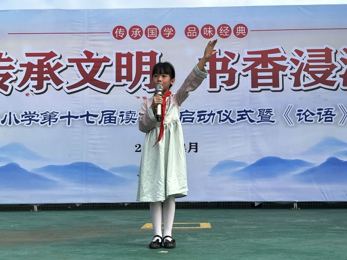 教师代表付丽丽老师宣读了读书节倡议书,她号召同学们读诗、读词、读曲、读天下文章;书山、书水、书情、书心中感想;阅读经典,阅读精神,阅读中华!立德、立志、立人,传承中华文明,传承中华血脉!呼声迭起,声声入心。六(3)班学生代表池宇恒和三(6)班学生代表梁楚琳分别做了《优秀为邻 书香做伴》和《至乐不如读书》的倡议。他们都倡议大家用读书来温润、丰盈自己的人生,用阅读通古追远,珍惜最佳的读书时光。