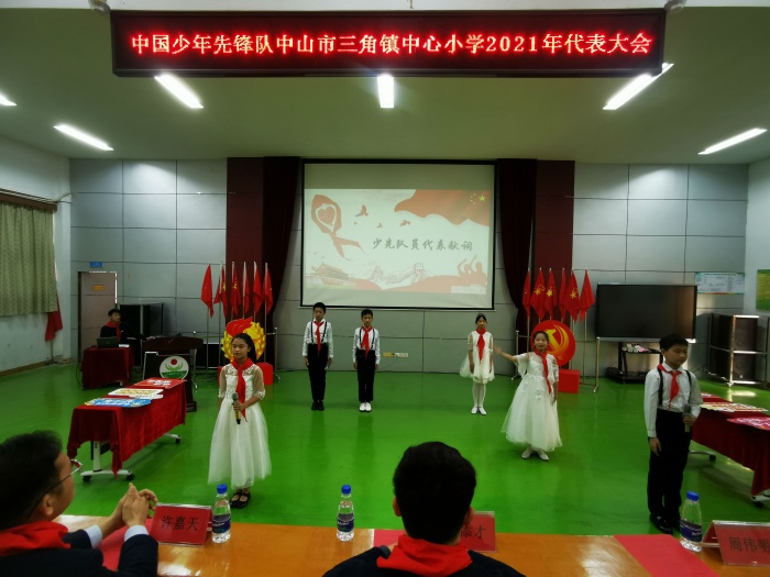 第三项议程选举中国少年先锋队中山市三角镇中心小学第二届大队委员会委员。吴博事校长和段美娟副校长为新上任大委员授队干标志。第四项议程选举中国少年先锋队中山市第二届工作委员会委员,团委副书记、少先队总辅导员许嘉天老师为新上任工作委员会授聘书。