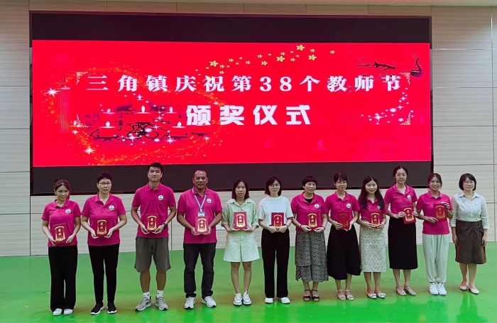 9月9日,三角镇党委委员何永远率领一行领导到中心小学进行颁奖、慰问活动,为教师们送上了党和政府的亲切关怀和节日问候。活动第一项议程是领导为市镇优秀教师颁奖。第二项议程是吴博事校长作表态发言,他表示衷心感谢上级领导的关怀和支持,学校将勠力同心,继续办好人民满意的教育。第三项议程是党委委员何永远殷切寄语。他希望全体中心人能继续在原有基础上,发扬更高、更佳的精神,做有理想信念、有道德情操、有扎实学识、有仁爱之心、让党和人民满意的“四有”好老师。全体中心人将铭记于心,力争更上一层楼。