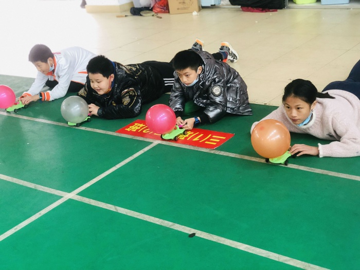 简易的跑道前,选手小心摆放小车,小脸上尽是严肃的神情,不敢有一丝懈怠。比赛一开始,场地顿时安静下来,同学们或是在屏息等候,或是在紧张地观察其他小组的成绩。男生、女生鼓着腮帮子,使劲吹,希望彩色的气球载着他的愿望远行。