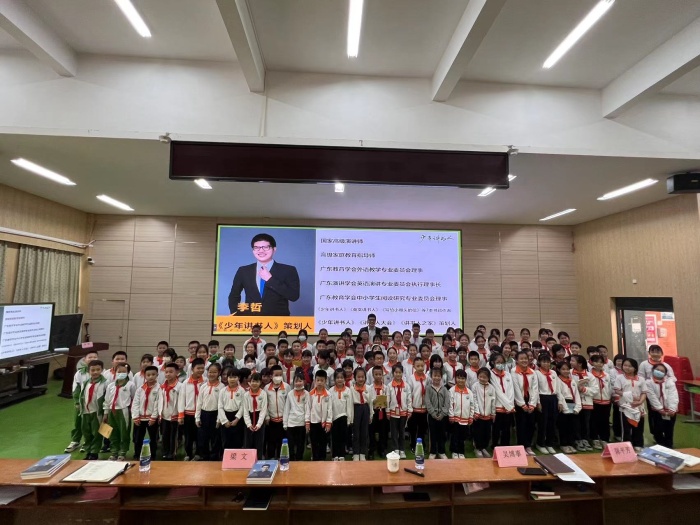 广东省《少年讲书人》电视展评活动策划人兼专家团成员、国家高级演讲师李哲老师和《少年讲书人》组委会成员陈秀文老师等一行携着“讲书”春风莅临三角镇中心小学,分享讲书经验。三角镇教育和体育事务中心副主任梁文、中心小学校长吴博事等全体行政、学校各班学生代表、文学社辅导老师和社员参与了此活动。