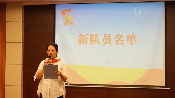 庄严宣誓后,一(4)中队的张景行队员作为新队员代表发言,他表达了无比愉悦的心情和积极向上的决心。学校少工委大队辅导员钟老师为各个中队授中队旗;德育主任谢万明主任为一年级各中队的中队辅导员颁发聘书,看着鲜艳的红领巾和矗立的中队旗,新队员们异常兴奋,全场响起了热烈的鼓掌声和呐喊声。