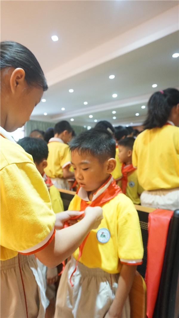 为迎接这次入队仪式的到来,一年级各中队提前开展了队前教育,观看队知识视频、学习队歌、填写入队申请书……帮助新队员们树立“红领巾小主人”意识。7月10日上午8点,一年级同学穿着整齐的校服,踏着坚定的步伐有序地来到阶梯室,等待着他们人生中第一次意义非凡、激动人心的时刻——加入光荣的中国少年先锋队组织。