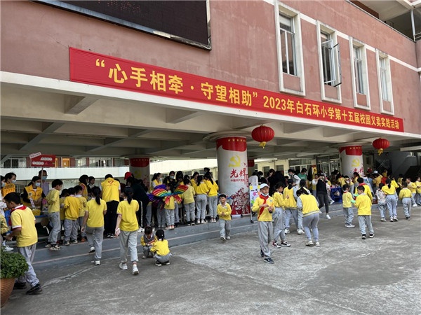 “东风好作阳和使,逢草逢花报发生”,三月天,和风艳阳,疫散花开,在这欣欣向荣的学雷锋月,为践行社会主义核心价值观,进一步培养学生以实际行动诚信做人、爱心助人的品质,树立团结合作、勤俭节约的意识,激发孩子参与公益活动的热情,3月10日下午,三乡镇白石环小学举行了以“心手相牵 守望相助”为主题的第十五届校园义卖实践活动。义卖所得款项将用来作为捐助对口帮扶学校——潮州市饶平县上饶镇中心小学购买图书、文具、体育用品等。