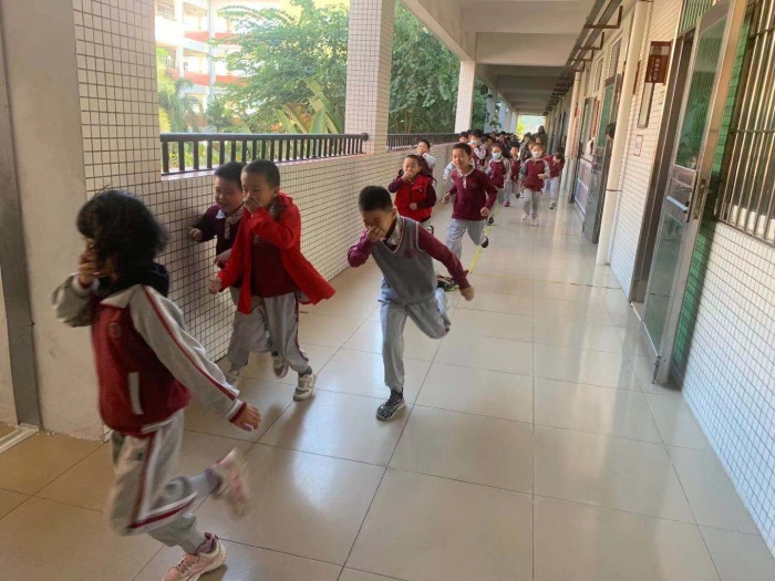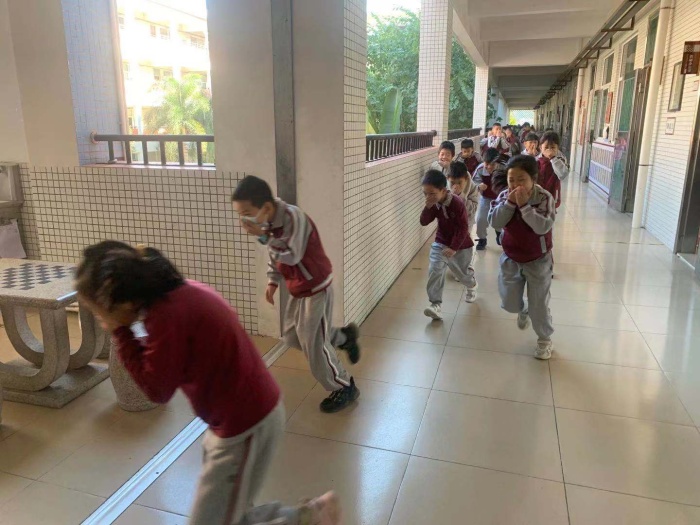上午9:52分,当学校广播室发出的防空警报信号后,正在上课的全校学生,在任课老师的组织引导下,迅速撤离教室,按指定路线有序疏散逃生。顿时,学校各楼层走廊上、各楼梯上人头攒动,各班都是分为两列纵队,手捂住口鼻,快速、有序地向操场撤离。