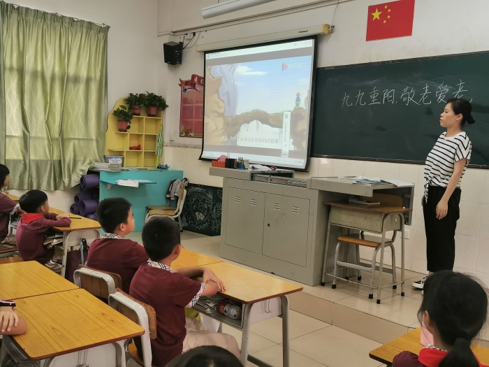 “百善孝为先" ,孝顺父母,尊敬长辈,是中华民族的传统美德。新圩小学德育处陈文丽主任先通过广播向全校学生发出倡议,引导学生要弘扬中华民族尊老敬老的传统美德,营造良好的爱老助老社会氛围,展现当代新圩水滴娃的精神风貌,倡议学生一要树立敬老之心,二要奉献孝老之意,三传递助老之情,学会关爱身边的每一位老人, 让老年人(尤其是自己身边的爷爷奶奶、外公外婆)在重阳佳节过得更有价值、有意义,让他们体会到节日的快乐,让他们的生活更加幸福。接着由班主任老师通过PPT给学生讲解重阳节的由来及意义,透过视频故事更直接生动地让学生了解这一传统节日---重阳节。