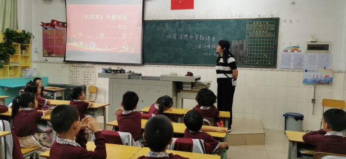为帮助青少年树立良好的法治观念,增强青少年的法治安全意识,2020年10月28日上午11:20,新圩小学诚邀广东铭兴律师事务所陈路芳律师来到学校,为全体师生开展《民法典》普法宣讲活动,其中四年级学生到阶梯室现场听课。