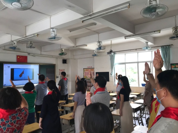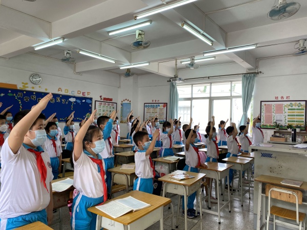 早上8:00,雍陌小学四至六年级的全体学生和全校教师一起,共同观看了中山市体育和教育局录制的复学第一课“天使归来,英雄开讲”主题升旗仪式。