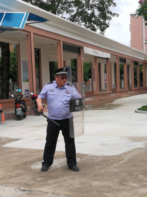 随后,叶警官针对在校园范围内可能发生的突发性恐怖袭击,组织大家学习了“暴徒”突然闯进学校,如何冷静应对、与其周旋等待警方支援的技巧,为了提高大家快速有效地应对突发事件的能力,现场还进行了模拟演练:“暴徒”冲进校园,安保人员迅速出动一个举着盾牌冲在最前面,拦住“暴徒”,一个高举防暴叉,拦腰按住“暴徒”其余人迅速上前围剿,与其周旋等待警方支援。最终“暴徒”被按在地。整个演练过程组织有序,大家配合默契,达到了演练的预期目的。